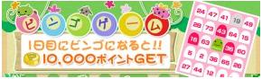 1週間で5×5マスのカードから1通りのビンゴを目指します。毎日5種類の当選番号が発表され、初日にビンゴが成立すると、賞金10000ポイントがプレゼントされます。げん玉のビンゴゲームは攻略アイテムが存在せず順位も関係ないため、参加者全員に均等に1000円ゲットのチャンスが約束されるという長所があります。スマホ版げん玉と連動の為PCと両方で番号確認ができます。