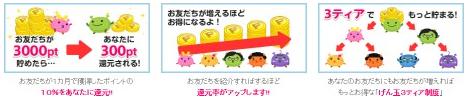 げん玉をまだ利用していない人に紹介すると、げん玉3ティア制度によって様々なお得な特典を得ることができます。お友達紹介の手段にはメール、ブログやホームページ、FacebookやTwitterやmixiなどのSNSを利用することができます。
