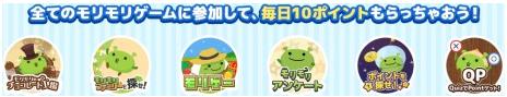 10万円分のギフト券や3DSなどのゲーム機、ポイントなどの豪華賞品が当たるげん玉版の無料ガチャです。モリガチャに1回チャレンジするためには、モリモリ選手権、ポイントの森、げん玉電鉄、サービス利用の4種類の稼ぎ方をクリアし、ガチャチケットの条件を満たす必要があります。また、必ず100〜1000pt獲得できるモリガチャDXも存在します。